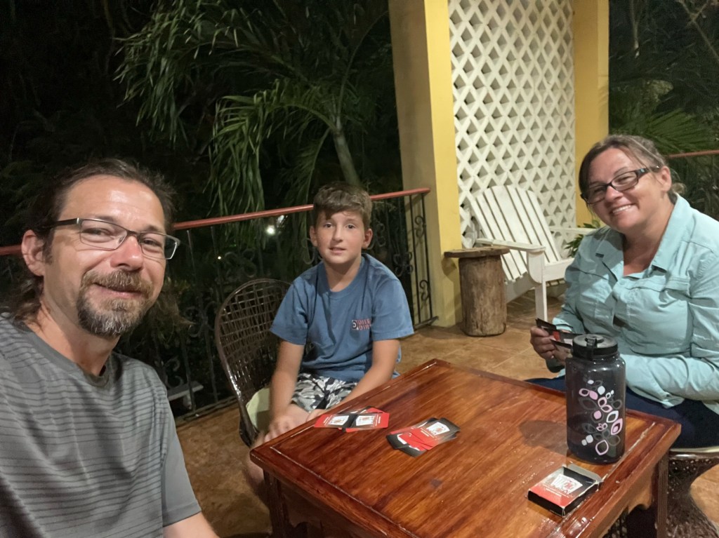 By dinner, most of the businesses were back open again, and we had a really good meal at the hotel restaurant. Henry had pancakes and you might have thought he’d never eaten anything quite so good. After dinner, we sat outside under the breezeway by our room and taught Henry how to play Hearts and laughed about how much misadventure we’d been through during the week.