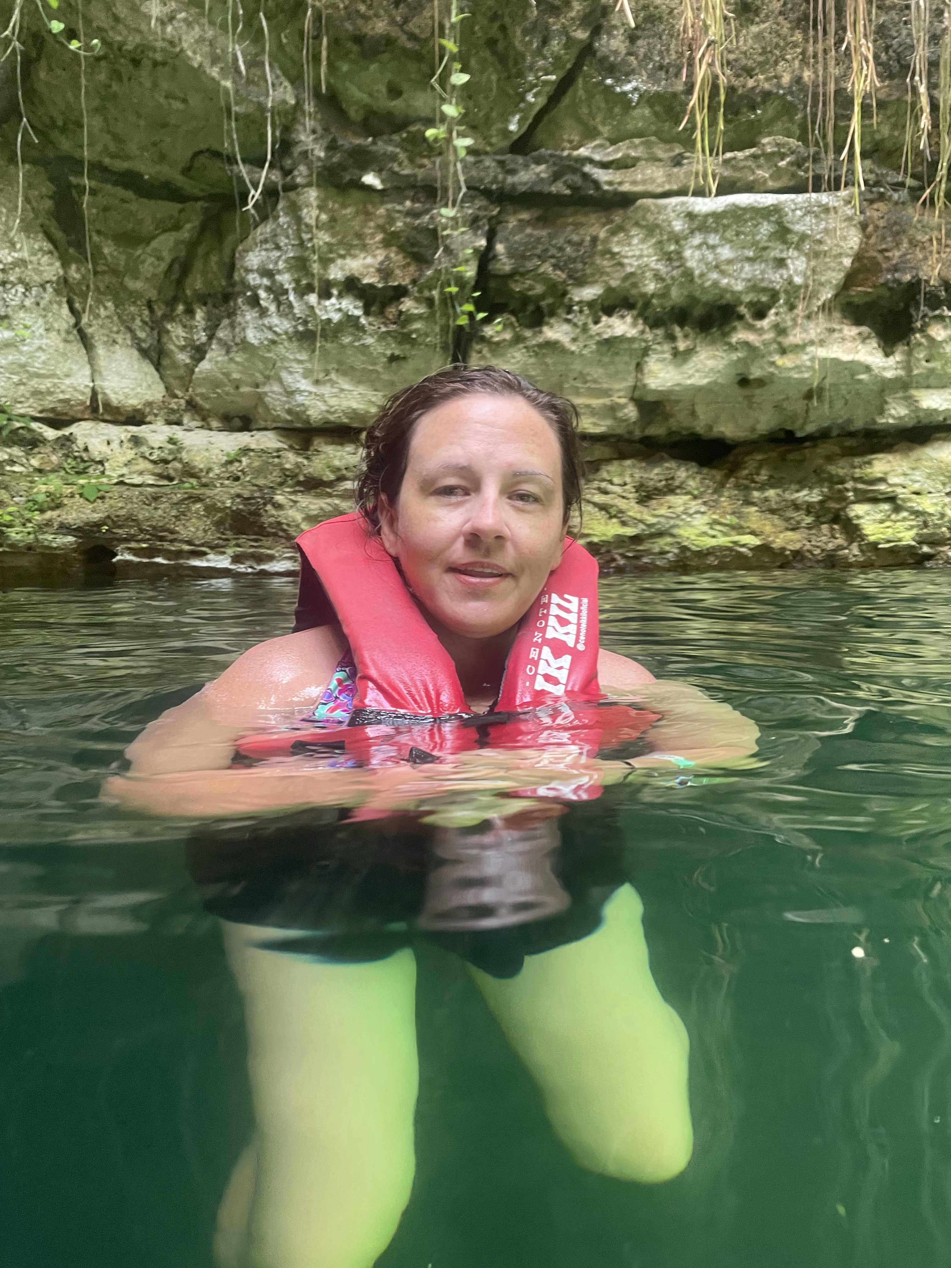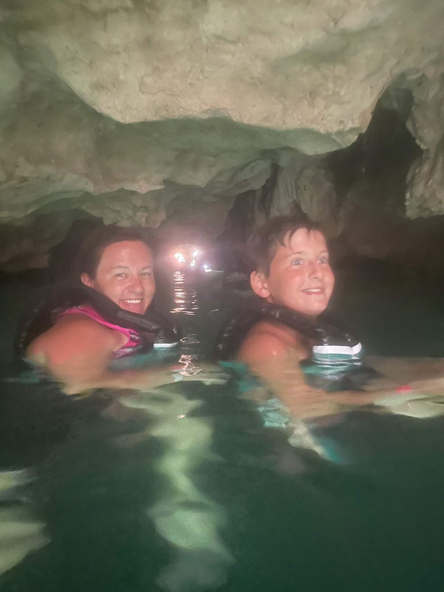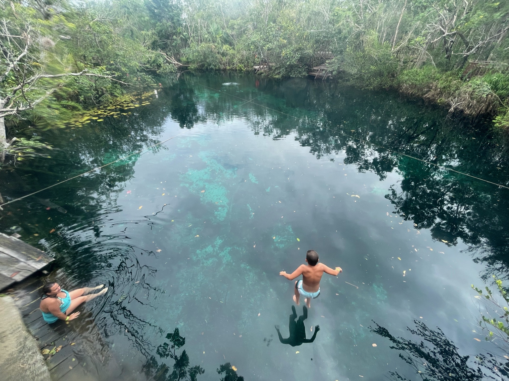 At Casa Tortugas, they had two open cenotes and two closed ones (in caves). We had a great time exploring three of the four cenotes there (one was closed to visitors for the day). Tres Zapotes was a long narrow river-like cenote and it was open. Cenote Dorca was another open cenote that was more like a water oasis with a wooden boardwalk surrounding it and a few jumping platforms. Henry jumped in from the 15’ platform at least 10 times. Cenote Wisho was a closed cenote, and it was my favorite. You entered the cenote through a set of stairs that descended into the cave. The water was about 75’ deep, and the ceiling of the cave was only a few feet from the surface of the water. Once we were all in the water, our tour guide dove in and swam under all of us to lead us through the cave and help us find the exit on the other side.