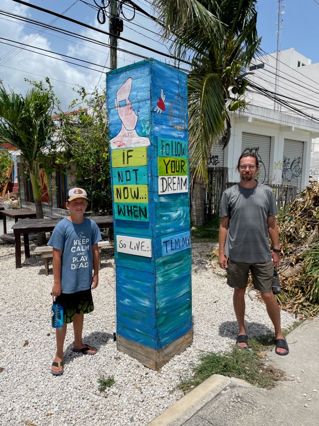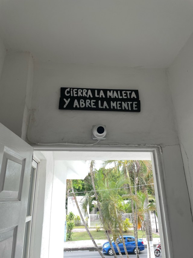 In our hostel Caribo Cozumel in Cozumel, Mexico. It says Close your suitcase and open your mind.